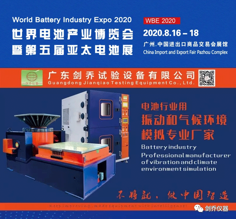 2020年8月16-18日,廣東劍喬試驗設(shè)備有限公司【劍喬儀器】將攜旗下最新試驗設(shè)備亮相2020世界電池產(chǎn)業(yè)博覽會暨第五屆亞太電池展,現(xiàn)場展示:振動試驗系統(tǒng)、溫濕度振動三綜合箱、高加速沖擊試驗臺、恒溫恒濕試驗箱、冷熱沖擊試驗箱等試驗設(shè)備及鋰電池相關(guān)試驗解決方案。