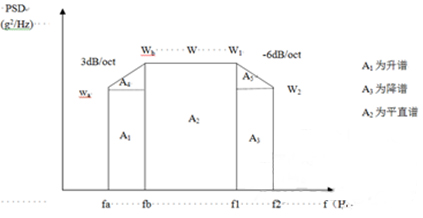 為了簡便起見,往往將功率譜密度曲線圖劃分成若干矩形和三角形,并利用上升斜率(如3dB/oct)和下降斜率(如-6dB/oct)分別算出wa 和w2,然后求各個幾何形狀的面積與面積和,再開方求出加速度總均方根值。